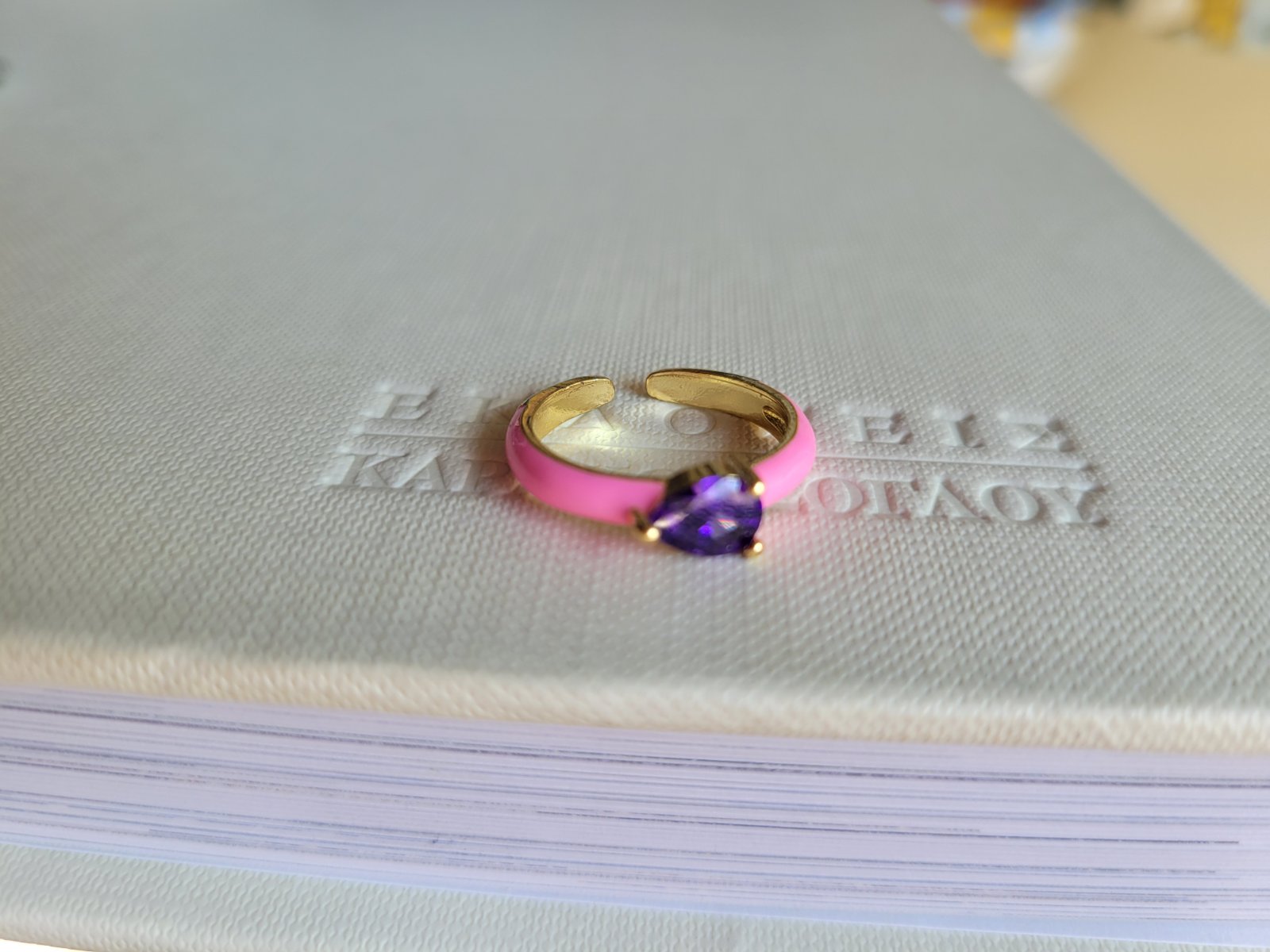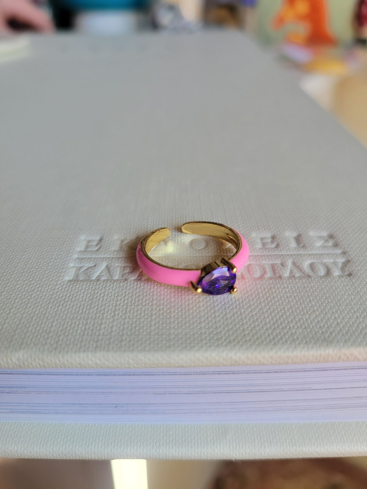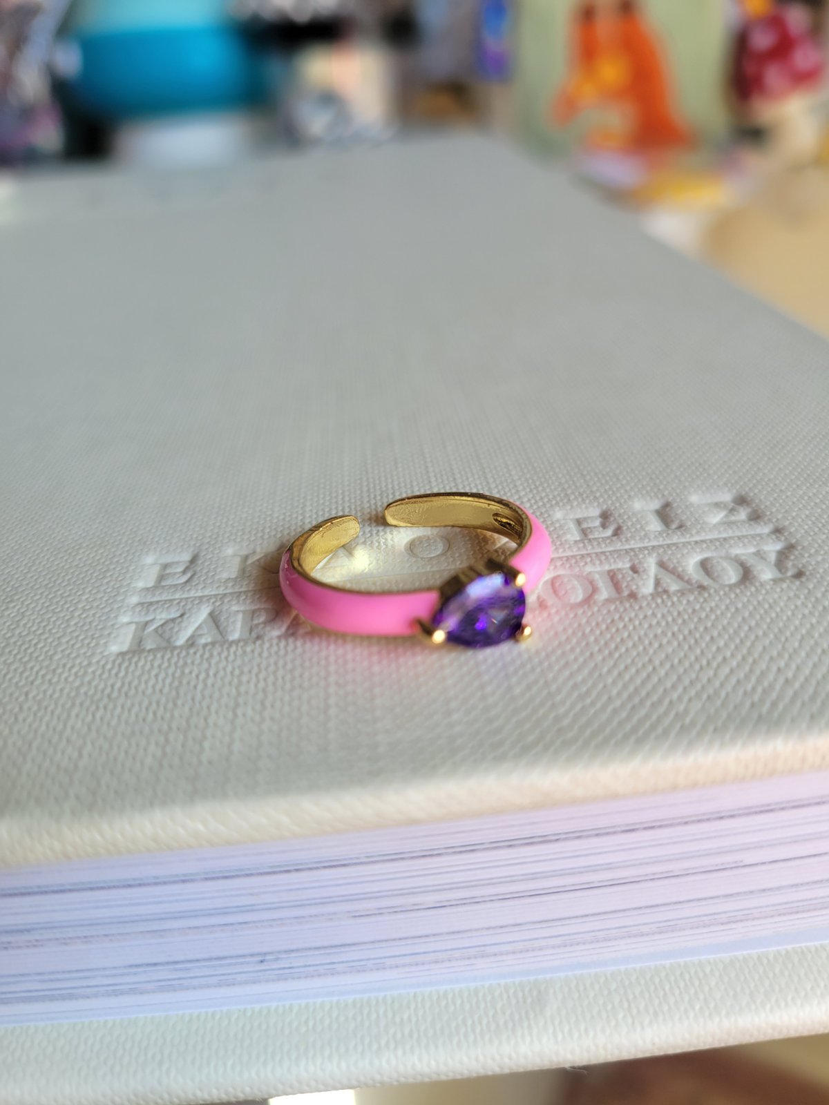 Δαχτυλίδι με ροζ σματο και κρύσταλλο σε σχήμα δάκρυ και μωβ χρώμα στο κέντρο.