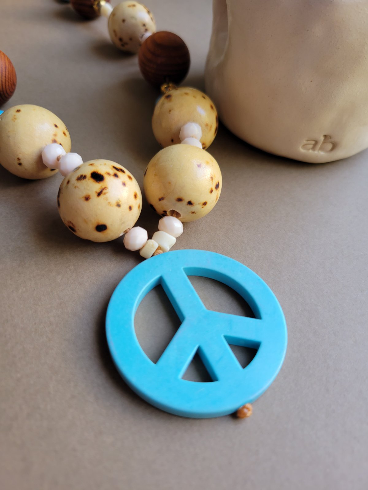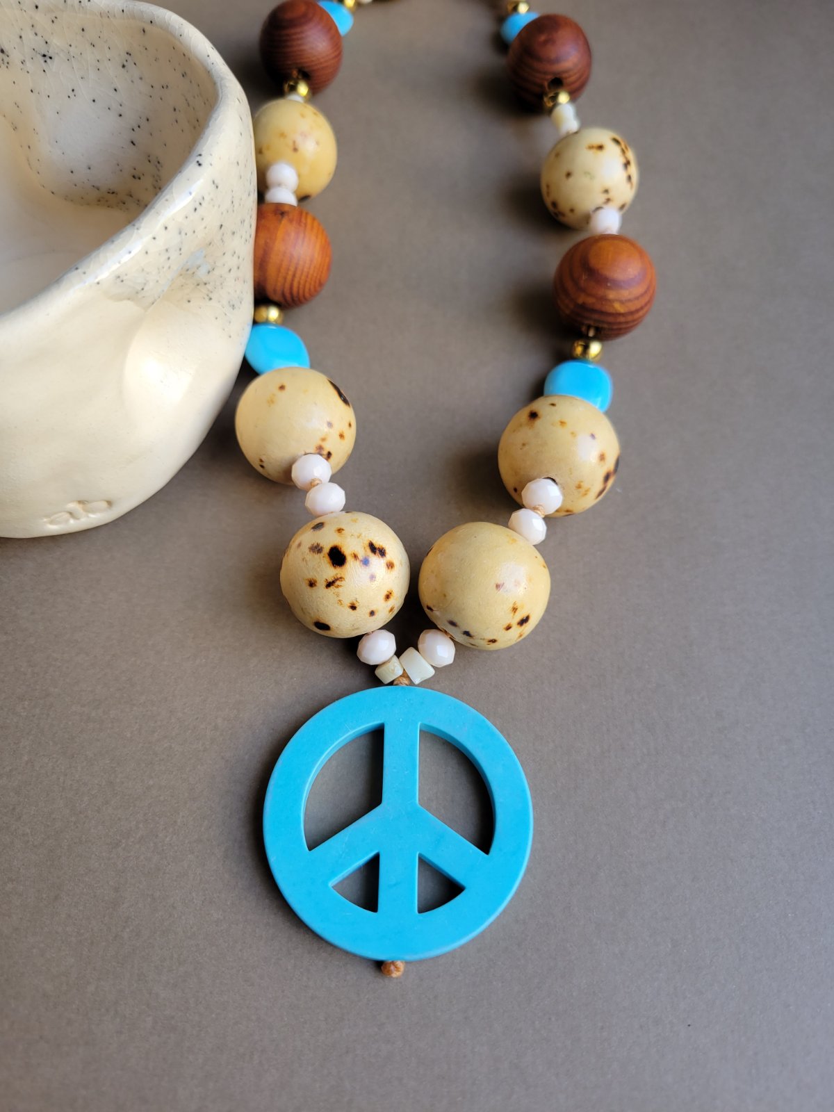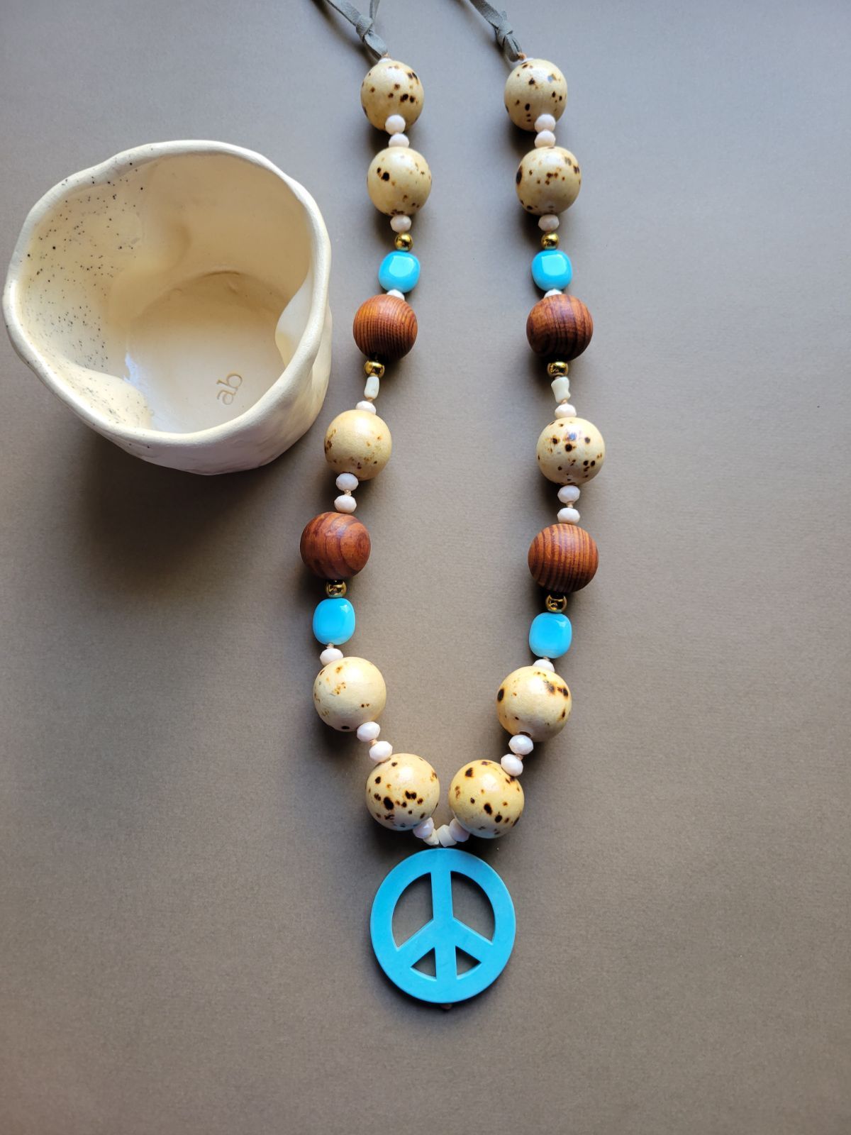 Κολιέ μακρύ με ημιπολύτιμη πέτρα χαολίτη σε τυρκουάζ χρώμα και σχήμα “piece” δεμένο με μπεζ κερωμένη κλωστή , κρύσταλλα , αιματίτη , ξύλινες πέτρες και στο πίσω μέρος πλακέ κορδόνι καστόρινο.